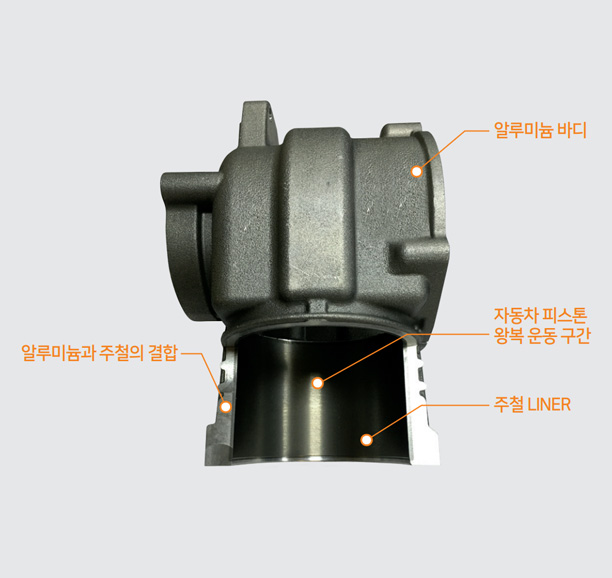자동차 부품 중 CRANK CASE류는 실린더 왕복 운동으로 인한 소재 마모를 최소화 시키기 위하여 CASE의 재질을 대부분 주철을 사용합니다. 하지만 영진기연은 중력 주조 방식으로 주철로 된 LINER와 알루미늄 케이스를 결합 하여 부품 성능은 유지 하면서 소재 중량을 줄여 연비를 높이고, 제품의 원가를 절감하였습니다.